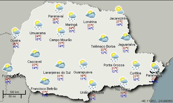 No decorrer do sábado o tempo não chega a ficar totalmente estável no oeste e todo o sul, mas não há previsão de chuvas e o sol aparece entre nuvens. Nos demais setores ainda há condições para chuvas ocasionais entre a tarde e noite. FONTE: SIMEPAR