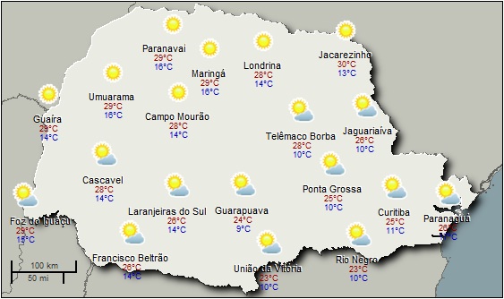 No sábado uma frente fria avança pelo Rio Grande do Sul, mas no Paraná pouca coisa muda em relação ao que foi observado na sexta-feira. Ou seja, novamente teremos um dia de tempo estável, com muito Sol e temperaturas elevadas à tarde. Os índices de umidade relativa também continuam baixos, com menores valores no oeste, noroeste e norte.