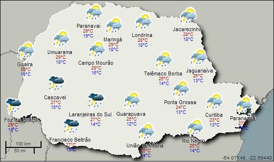 Uma nova frente fria chega ao Sul do Brasil e avança rapidamente nessa terça-feira. No Paraná a instabilidade atmosférica aumenta bastante e o dia já começa com chuvas em algumas regiões do Estado, especialmente nas áreas mais próximas da divisa com Santa Catarina. Durante a tarde o tempo fica instável em todas as regiões paranaenses, com previsão de pancadas de chuva e trovoadas. Há risco de temporais, mas de forma localizada.