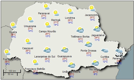 A massa de ar frio e seco deixa o tempo estável na maioria das regiões paranaenses no feriado. Novamente as temperaturas apresentam valores baixos ao amanhecer e nevoeiros formam-se entre os Campos Gerais, centro-sul e parte da RMC. Entre o litoral e a Sera do Mar o céu fica encoberto em boa parte do dia, pois há ingresso de umidade proveniente do Oceano. No interior do Estado o tempo fica firme e ensolarado, por isso o frio logo perde intensidade e esquenta rápido até a tarde. Isto é, a previsão é de uma condição bem típica de outono no Paraná durante a Sexta-feira da Pai xão. FONTE: Simepar