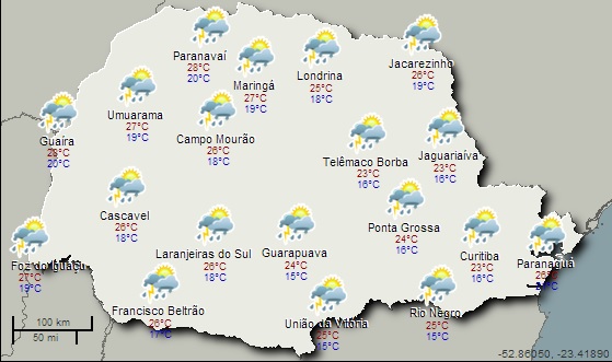 Poucas mudanças nas condições do tempo nesta quarta-feira no Paraná. O ar segue bastante instável, ou seja, o céu continua com muita nebulosidade no Estado ao longo do dia, com chuvas a qualquer hora. Os acumulados de chuva devem ser mais significativos entre o oeste e o noroeste paranaense. Temperaturas amenas.
