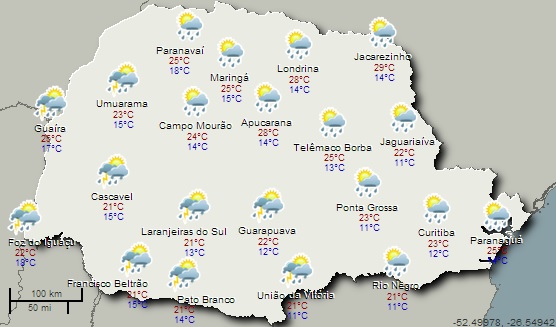 Uma área de baixa pressão pronuncia-se sobre o Paraguai, onde a instabilidade fica extremamente elevada. Desde as primeiras horas deste sábado, chuvas fortes são esperadas nas áreas paranaenses que fazem fronteira com o País vizinho e gradativamente avançam pelas demais regiões. Até o fim do dia há previsão de chuvas em todas as áreas do Estado, mas de forma pontual, ou seja, as precipitações ocorrem em forma de pancadas, ocasionalmente fortes mas com distribuição bastante irregular. Há risco de ventos fortes no centro e oeste, onde o acumulado de chuva é maior. Por conta do cenário instável, as temperaturas ficam mais amenas à tarde.