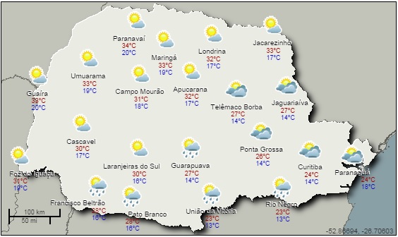 O eixo mais instável da frente fria desloca-se em direção ao Oceano Atlântico sem alterar significativamente o tempo sobre o Paraná. Nessa sexta-feira até ocorre um aumento de nebulosidade no Estado, mas só é esperada chuva para os municípios paranaenses mais próximos das áreas de divisa com Santa Catarina. Do oeste ao norte segue bastante quente, enquanto que no leste e sul a sensação de calor diminui um pouco. Fim de semana será de sol e calor na maior parte do território paranaense. Fonte: Simepar