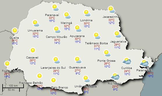 A quarta-feira apresenta tempo estável no Paraná. Uma massa de ar seco predomina no Estado e regiões vizinhas, favorecendo para o predomínio do sol na maioria das regiões do Estado. A nebulosidade fica mais concentrada na faixa leste por conta dos ventos úmidos provenientes do Oceano, mas o sol deve aparecer à tarde. Novamente a elevada amplitude de temperaturas volta a aparecer no estado. Temperaturas mais baixas no amanhecer, principalmente na metade sul e bastante calor à tarde na faixa norte. Fonte: Simepar