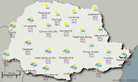 Mudanças começam a ocorrer em parte do Paraná nesta quinta-feira. Nas primeiras horas da madrugada a nebulosidade aumenta na região sudoeste do Estado, em resposta a uma área de baixa pressão que pronuncia-se no Paraguai. A presença deste sistema instável traz possibilidade de chuvas a faixa sul paranaense a qualquer horário do dia. As chuvas serão mais significativas em Santa Catarina, mas as áreas do Paraná que fazem divisa com o Estado vizinho apresentam condições para chuvas ocasionalmente mais intensas. À tarde há condição para pancadas de chuvas também nos Campos Gerais, Região Metropolitana de Curitiba e parte do Norte Pioneiro. Fonte: Simepar