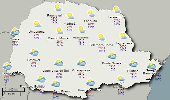 A terça-feira começa com nebulosidade variável em grande parte das regiões paranaenses. No interior do Estado, o sol aparece entre nuvens e as temperaturas sobem rapidamente deixando o tempo abafado, principalmente entre oeste e norte do Paraná. No leste, o dia começa com temperaturas amenas, porém no decorrer do dia as temperaturas ficam agradáveis com o sol aparecendo entre nuvens. Entre a tarde e noite, são esperadas pancadas de chuvas isoladas nas regiões que fazem divisa com Santa Catarina. Fonte: Simepar