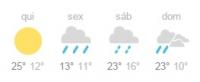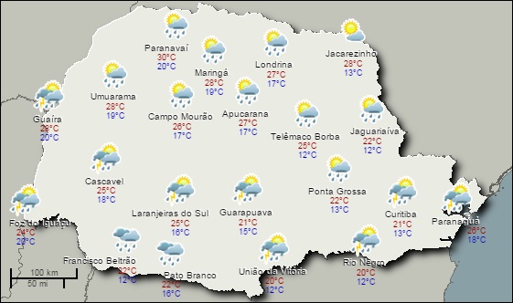 Ao longo da sexta-feira a frente fria atua principalmente entre o estado de Santa Catarina e em áreas da metade sul do Paraná. São esperados portanto, eventos de chuvas, que podem ocasionalmente serem fortes e acompanhados de rajadas de vento moderado/forte. Apenas a faixa norte do Paraná é que ainda não sofre a influência direta da frente fria, mas as nuvens aumentam, com chuvas mais isoladas e o calor diminui.
