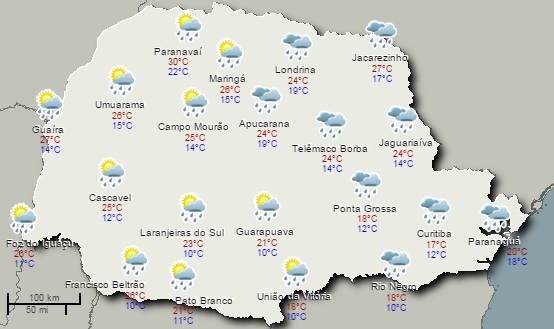 O tempo segue instável nas regiões paranaenses durante a terça-feira. Apesar do deslocamento do eixo mais instável da frente fria para o Oceano Atlântico, áreas de instabilidade se desenvolvem por causa do intenso fluxo de umidade entre o Paraguai, o norte da Argentina e o Paraná. Assim, novamente são previstas chuvas para a maioria das regiões do Estado. As temperaturas permanecem mais amenas e apresentam uma oscilação menor do que na semana anterior.