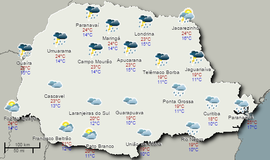 A quinta-feira começa com forte instabilidade atmosférica no Paraná. A frente fria desloca-se rapidamente pelas regiões paranaenses, com previsão de chuvas e trovoadas na madrugada em várias regiões. Há risco de temporais até o período da manhã, principalmente nas áreas mais ao norte do Estado. A tendência é de pouca variação da temperatura ao longo do dia, principalmente no litoral, RMC, Campos Gerais e no norte pioneiro. A partir da tarde o tempo melhora em praticamente todas as regiões paranaenses. Fonte: Simepar