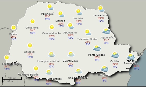 Fim de semana de tempo estável e de sol nas regiões paranaenses. No sábado ainda ocorre uma maior variação da cobertura de nuvens no leste e litoral do Paraná, mas o sol predomina ao longo do dia. Temperaturas mais amenas no amanhecer, porém ganham rápida elevação até a tarde e a sensação de tempo agradável prevalece. No domingo esquenta mais e até faz um pouco de calor nas regiões do Estado.