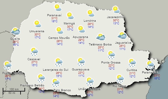 Nesta quinta-feira a circulação dos ventos em níveis mais elevados da atmosfera contribui para manter o tempo instável em parte do Sul do País. No Paraná as chuvas ocorrem preferencialmente na "metade sul" do Estado, mas de forma desorganizada. O risco de temporais, com ventos, é baixo, mas as chuvas devem vir acompanhadas por descargas atmosféricas por alguns momentos. No norte e no noroeste o tempo continua estável, mas com temperaturas já não tão elevadas. Fonte: Simepar