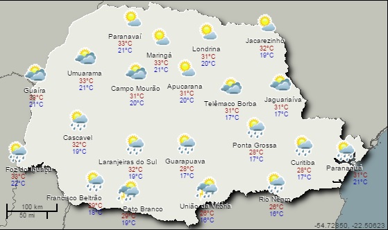Na quinta-feira a frente fria avança um pouco pelo Sul do Brasil, mas não tende a evoluir até o Paraná. O ar mais quente e o fluxo dos ventos em altitude impedem que o sistema frontal ingresse no Estado, porém, mesmo assim, há previsão de chuvas isoladas na "metade sul", principalmente nos municípios mais próximos da divisa com Santa Catarina. No norte paranaense segue com predomínio de sol e faz calor à tarde. A tendência é de aquecimento nos próximos dias no Paraná.