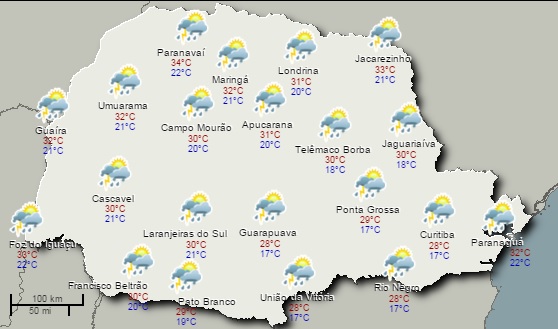 Nessas condições as áreas de instabilidade continuam intensificando-se principalmente a partir da tarde nas diversas regiões do Estado, com condições para temporais. Novamente o risco de chuvas fortes é maior entre o noroeste, oeste e o sudoeste paranaense.